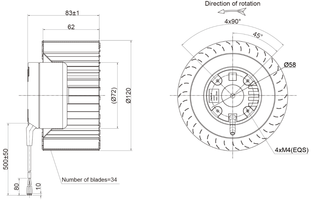 2.四芯線: 紅線=輸出電壓+10VDC(可作為調(diào)速輸入電壓或FG信號上拉電壓,需與上拉電阻器串聯(lián)使用,詳情見接線圖);黃線=0-10直流電壓調(diào)速/占空比調(diào)速;白線=轉(zhuǎn)速信號輸出 (示波器);藍(lán)線=接地線。
