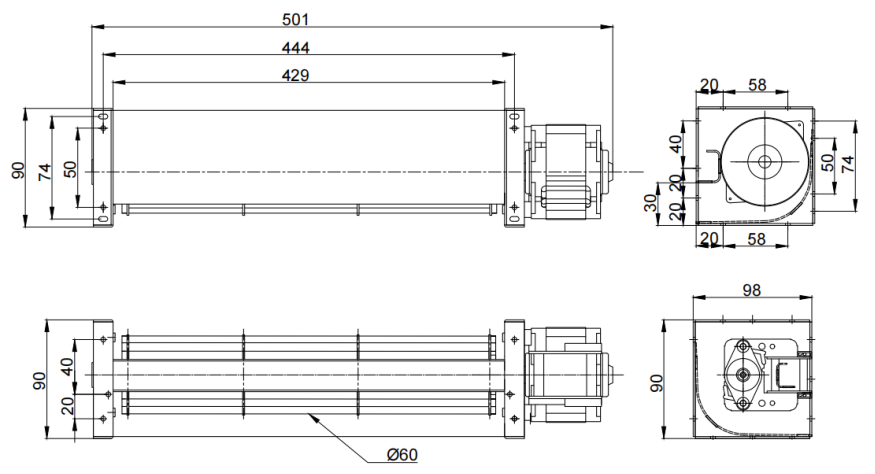 98mm X 90mmX501mm (see dimension drawing) |